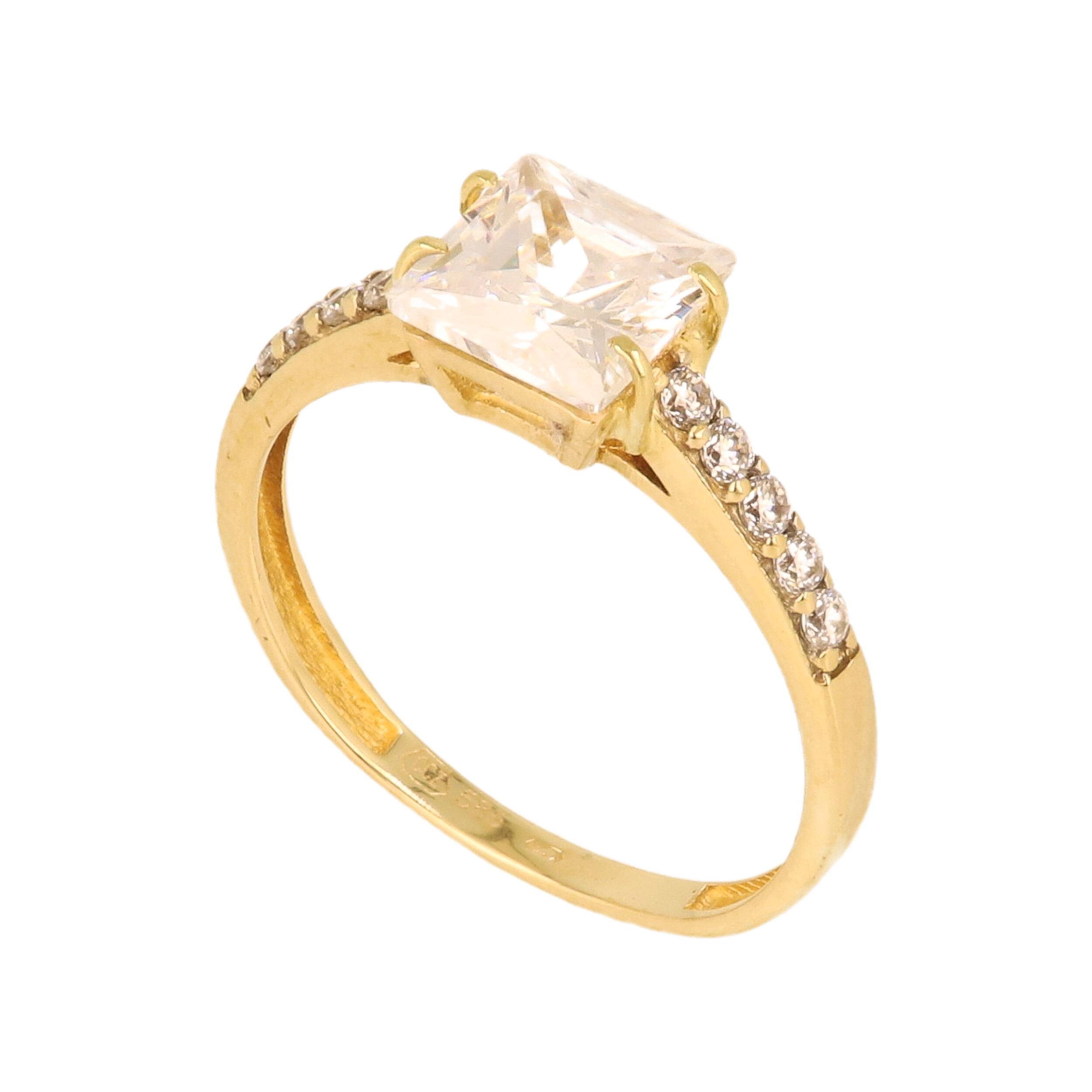 Tento elegantní zlatý prsten s výrazným čirým kamenem ve čtvercovém brusu působí doslova královsky. Široký centrální kámen doplňuje řada drobných zirkonů po obou stranách, které prstenu dodávají dechberoucí třpyt. Design je moderní, čistý a zároveň působivý — ideální jako zásnubní prsten nebo výjimečný dárek, který okamžitě zaujme a rozzáří každou ruku. ?