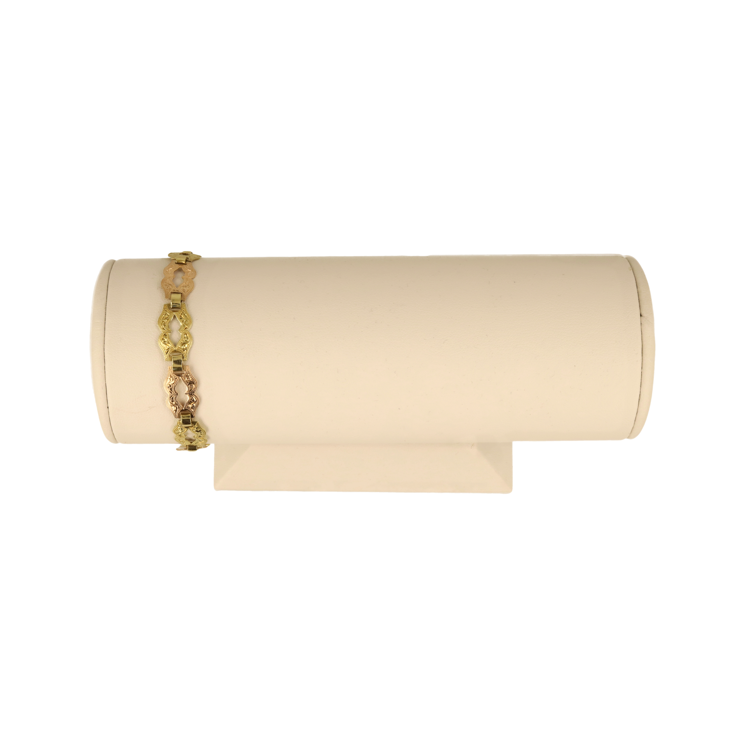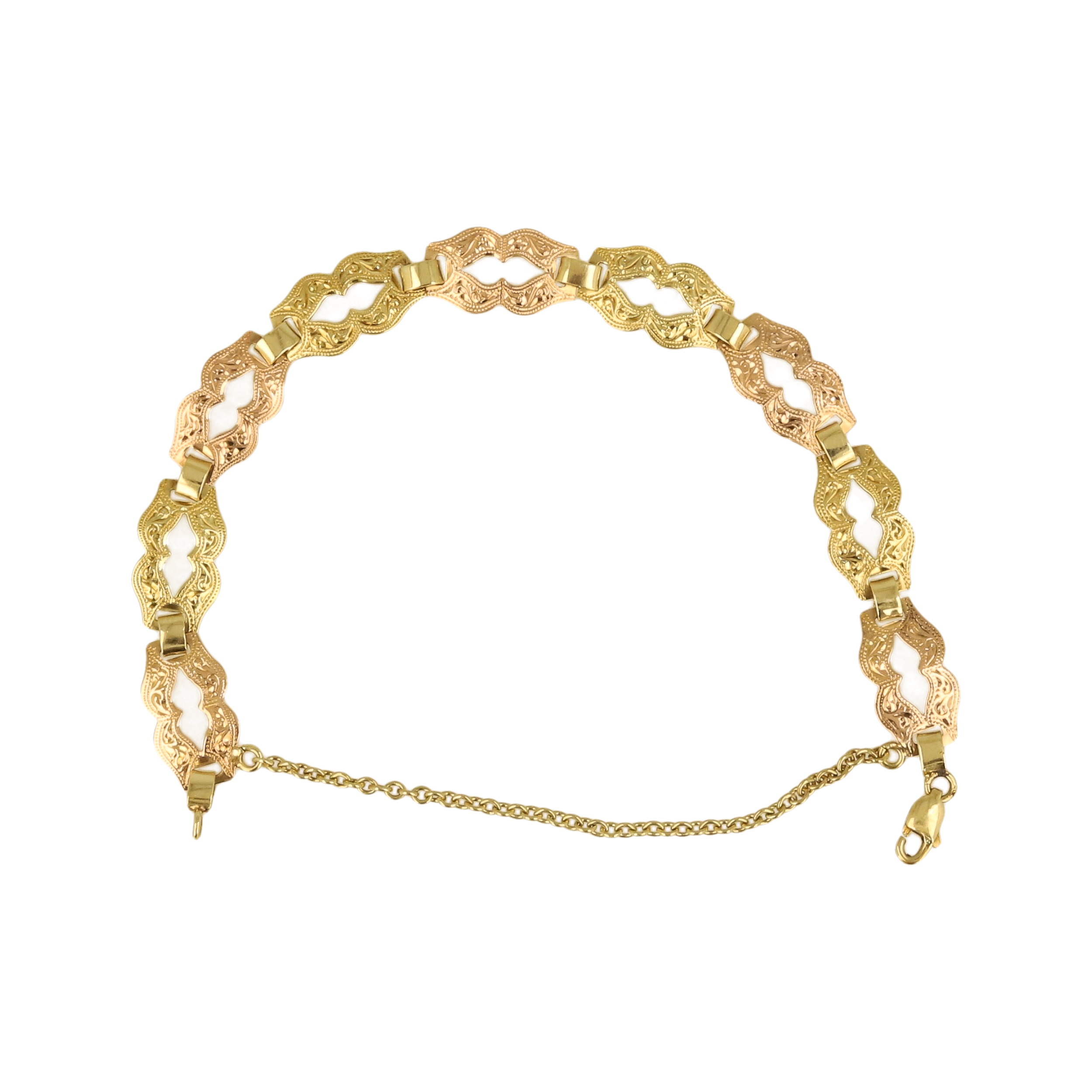 Tento dvoubarevný zlatý náramek vyniká propracovanými ozdobnými články, které kombinují žluté a růžové zlato do krásně sladěného, vintage laděného designu. Každý článek je detailně gravírovaný a vytváří efekt jemné krajky na zápěstí. Náramek působí luxusně, pevně, a díky bezpečnostnímu pojistnému řetízku je i maximálně praktický. Ideální volba pro ženu, která miluje elegantní, zdobené a opravdu výrazné šperky. ?