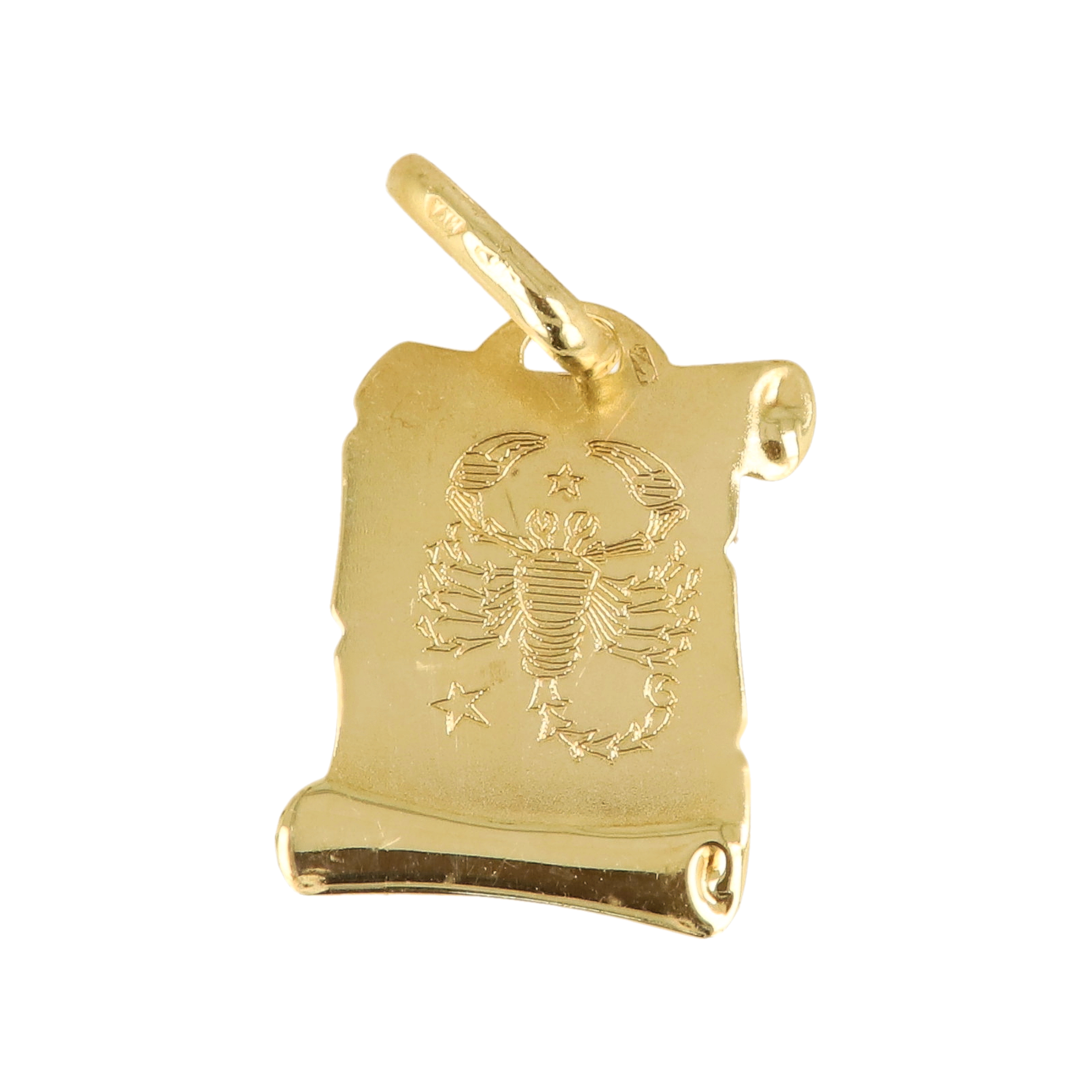 Zlatý přívěsek Štír na pergamenu – znamení zvěrokruhu ze zlata 585/1000 Lehký a decentní zlatý přívěsek o váze 0,74 g a velikosti 2,2 × 1,2 cm zobrazuje symbol Štíra vyrytý na stylizovaném pergamenu, který dodává šperku originální a elegantní vzhled. Vyrobený ze zlata 585/1000 krásně září a činí z tohoto talismanu ideální dárek pro všechny narozené ve znamení Štíra. Nejlépe se hodí ke zlatému řetízku typu Anker nebo Veneziana, které podtrhnou jeho jemnost a symbolický charakter.