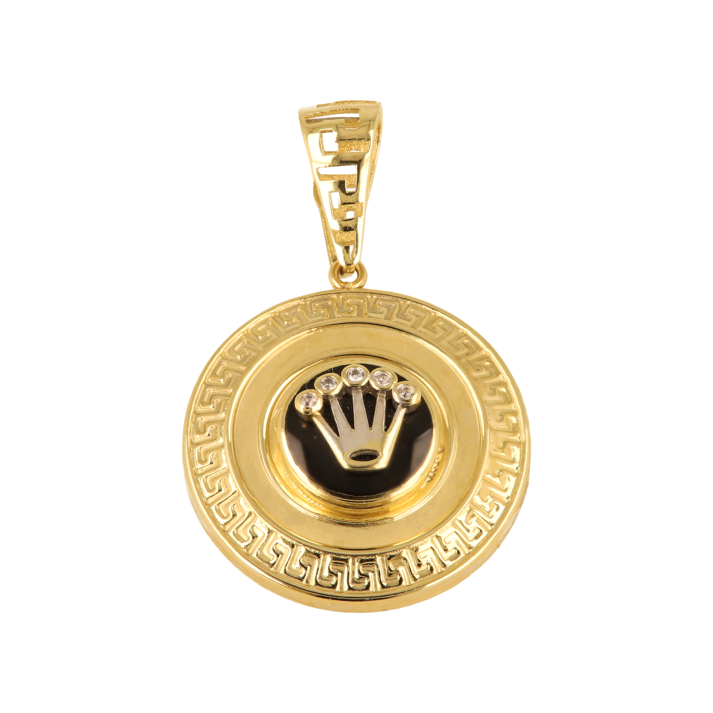 Zlatý přívěsek o průměru 2,7 cm je vyroben ze zlata o ryzosti 585/1000 (14 karátů) a váží 5,52 g. Kulatý tvar s motivem koruny působí výrazně a reprezentativně, přičemž detailní dekor dodává šperku luxusní charakter. Díky hmotnosti přes 5 gramů jde o pevný a masivnější kousek, který nejlépe vynikne na středně silném až silnějším zlatém řetízku. Jedná se o použitý šperk, který byl pečlivě zkontrolován a je připraven k okamžitému nošení. Výrazný symbol stylu a originality ze zlata 585/1000.