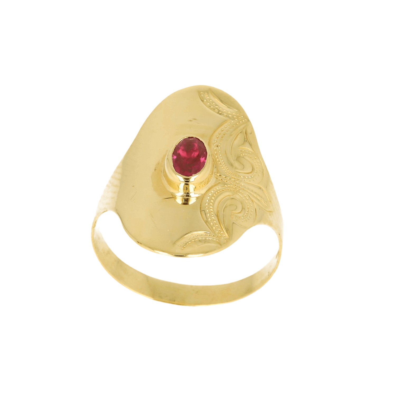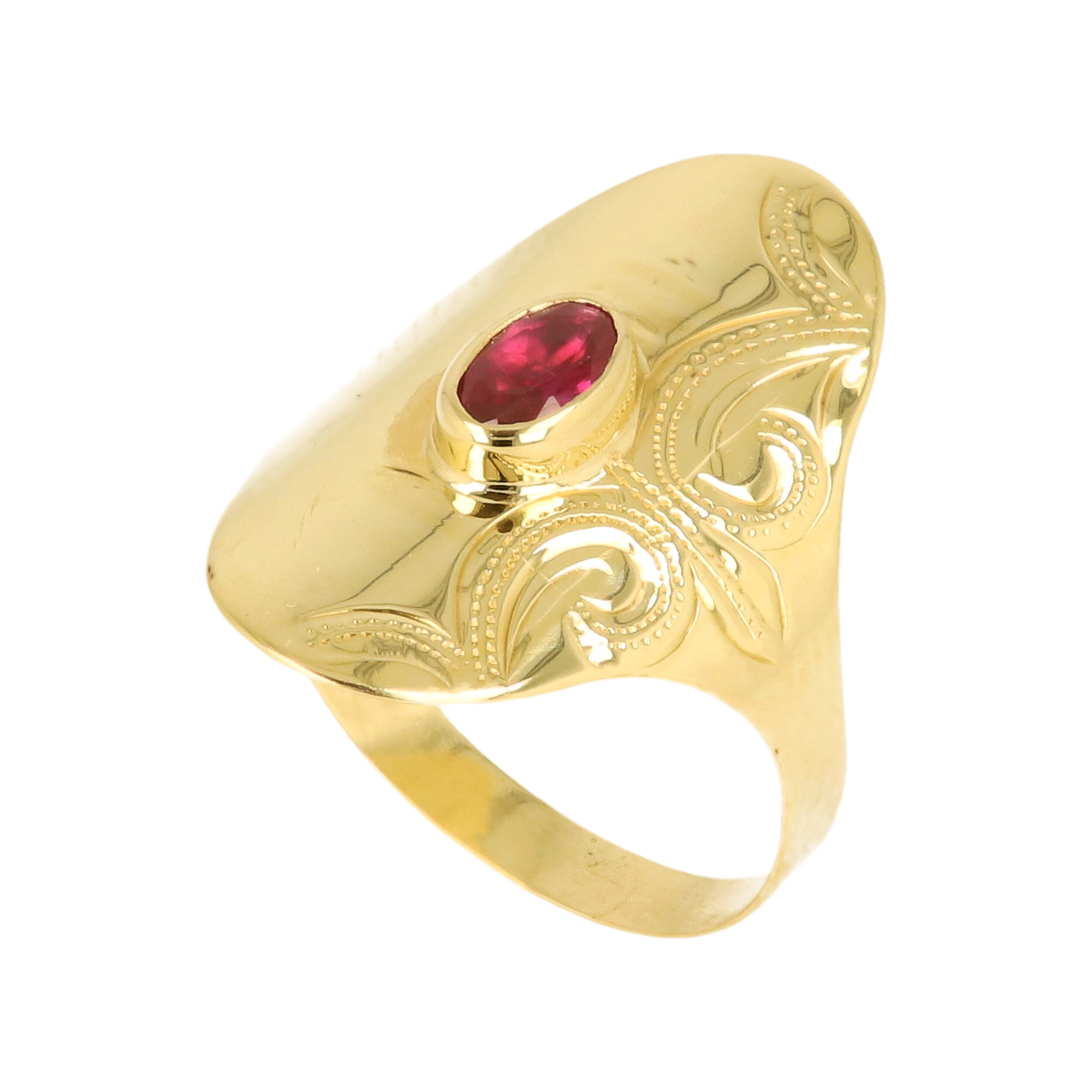 Tento masivní zlatý prsten okamžitě upoutá pozornost svou širokou, hladkou plochou zdobenou jemným orientálním rytím. Uprostřed září oválný červený kamínek, který celému designu dodává ušlechtilý a lehce exotický výraz. Prsten působí sebevědomě, elegantně a dokonale vynikne jako dominantní solitér na ruce. Ideální volba pro ženu, která miluje originální šperky s výraznou osobností. ✨